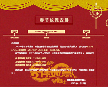 感谢大家长久以来对沈阳嘉越的支持与帮助。在此提前祝各位2017年春节快乐,身体健康,万事如意,鸡年大吉!